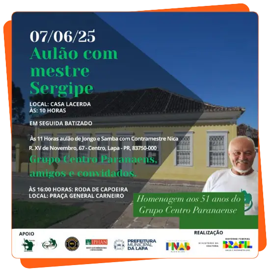 Convite do aulão de capoeira com o Mestre Sergipe, realizado por meio da Lei de Fomento Aldir Blanc municipal.